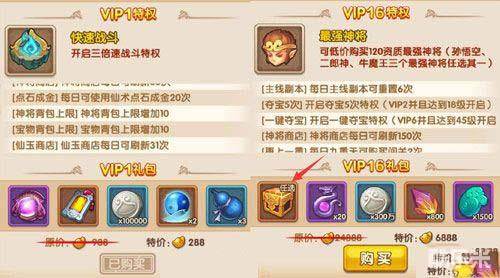 2、对于小R玩家来说,充值到vip5最好不过,因为到达这个等级后可以开启日常等战斗跳过,还能开启攻打六次仙界副本和进行中级巡逻,并且vip4会送一个橙色武将。