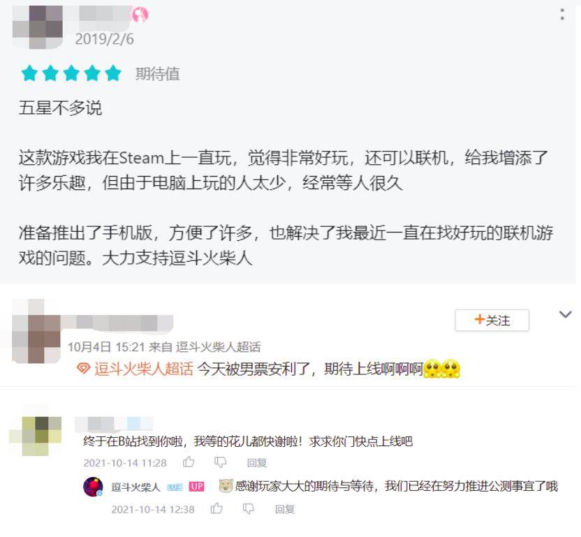 因游戏魔性奇葩的游戏机制、爆笑畅爽的对战过程,《逗斗火柴人》在官宣立项后,玩家的期待值就不断高涨:“五星好评不多”、“期待上线”、“求求你们快点上线吧”…