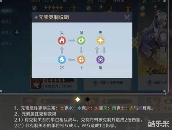 搭配英雄阵容的过程中,玩家们除了要关注英雄本身的品质外,还要关注英雄的属性,因为游戏里不同属性之间存在着相互克制的关系。基本属性一共有6种,分别是:土、水、火、风、光、暗。其中土、水、火、风四种元素循环克制,土属性克制水属性,水属性克制火属性,火属性克制风属性,风属性克制土属性,而光、暗两种属性则是互相克制。当有克制关系的单位互相战斗的时候,克制方对被克制方造成2倍伤害。