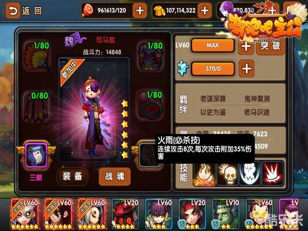 技能一:火雨 连续攻击8次,每次攻击附加35%伤害 善谋奇策的司马懿大人的必杀自然是要有出奇制胜的效果。不经意之间突然释放的火雨定能能在一瞬间给予敌人致命一击!
