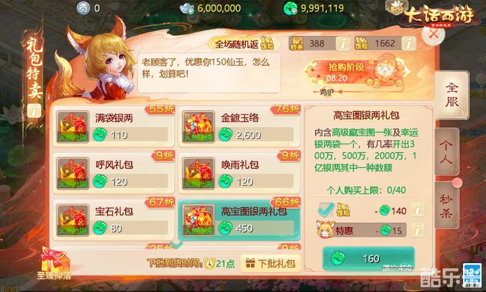 活动期间,狐小妖商店还将开启特惠,购买全服礼包(鸡驴阶段除外)和个人礼包,即可享受狐小妖送上的优惠福利!不仅如此,侠士们每次购买全服礼包(不含鸡驴阶段)和个人礼包,还将随机返还一定数量的“饭粒”,可用于抵扣下次购买礼包的费用!