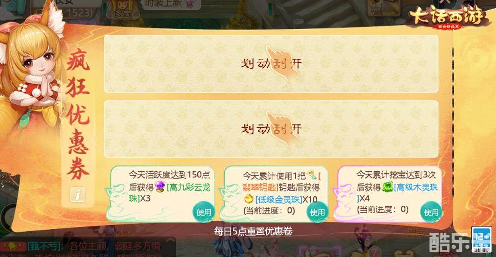 好物节期间,侠士们每日可通过刮刮乐获得优惠礼券。刮刮礼券有三重,每重有3张礼券,侠士可从每重礼券中选择一张使用。侠士获取礼券重数的方式共有三种:每日登录,消费任意数额仙玉,消费满180仙玉。