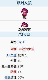 派对女孩是个困难模式之前的 NPC 商贩,出售喜庆的小玩具物品和家具。