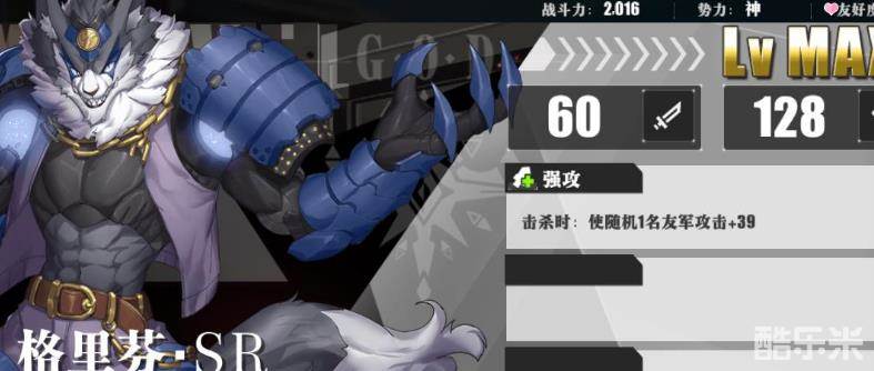 先来看一看SR的格里芬,这个品级的满级属性是60点攻击力和128的血量,在输出以及生存能力上都是不错的。技能的话就只带有一个“强攻”,在击杀一个单位之后可以随机提一个友军39点的攻击力,这个攻击提升只要格里芬在场就一直有的。但是这个品级技能只有一个就相对较弱了,实力一般吧。