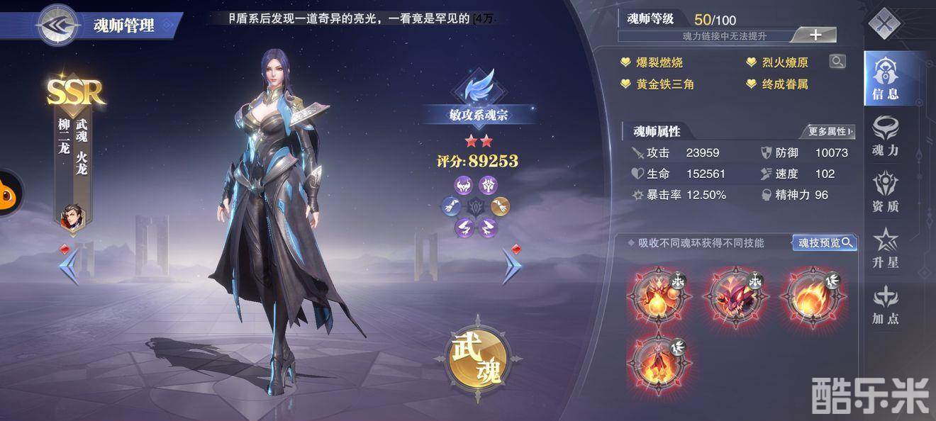 柳二龙是单体爆发极高的敏攻系魂师,她非常依赖灼烧状态和魂技增益带来的高额伤害加成,凭借这种强化机制,她能够在练度不高的情况下充当队伍的副c,将更多地资源集中给主力输出,使队伍整体的伤害更高。
