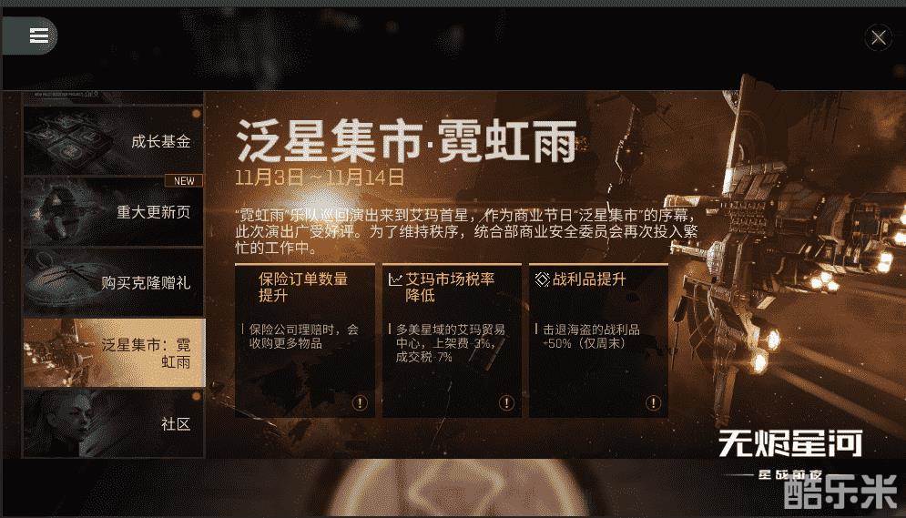 活动期间,新伊甸的所有保险生成的市场订单数量将增加,艾玛市场的税率也将降低!11月6日-11月7日,11月13日-11月14日期间,新伊甸所有异常掉落产出将得到提升,其中,击杀海盗掉落装备概率提升50%,掉落结构的概率提升25%!