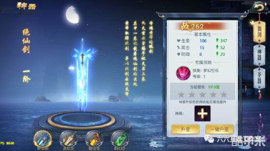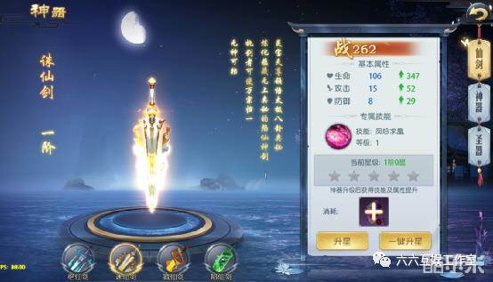 仙剑一共4种,分别是绝仙剑、诛仙剑、戮仙剑、陷仙剑,每一种仙剑对应一个主动技能,升级仙剑可以提升属性和技能,下面再简单介绍仙剑系统的进阶升星