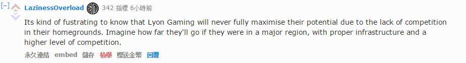 -由于只能在他们自己的赛区打比赛,Lyon可能永远都无法施展出他们全部的潜力,这不得不说是一种遗憾。想象一下如果他们可以进入五大赛区,享用更好的基础设施和进行更高等级的对抗,会达到什么样的一个高度。