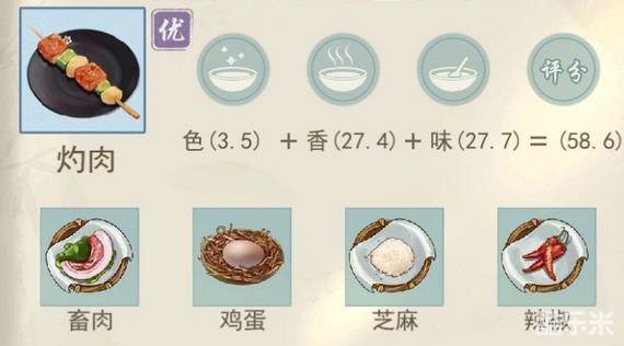 灼肉配方:畜肉+鸡蛋+芝麻+辣椒。