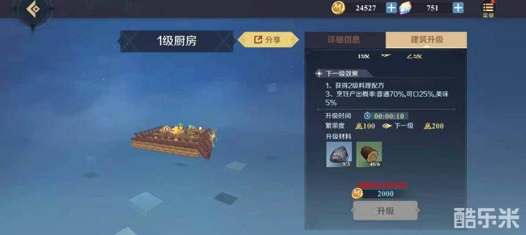 游戏中,不同的食物所能够提供的恢复效果是不同的,等阶越高的食物,恢复效果也越好。不过等阶越高的食物制作难度也就越高,一些高等阶的食物,不仅需要准确的搭配食材,还对厨房的等级有要求。目前游戏中厨房每提升一次等级,都可以解锁不同的食物,提升到8级后,可以解锁所有可以制作的食物。需要注意的是,厨房等级的提升会受到据点等级的限制,例如厨房想要升级到2级,前置条件是据点等级提升至4级。同时升级厨房还会消耗一定的材料,以及美索多。