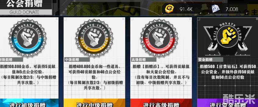第二个方式可以通过公会捐献来获得,在进入到公会界面之后点击捐献的图标可以来到这里。在捐献中是有很多选择的,前面两个是相对基础的,消耗的是金币来进行捐献,可以分别获得五点贡献和四十点贡献值。后面一个是高级捐献,需要消耗对应的货币才行,这个货币可以通过一些玩法来获得。最后就是大家比较熟悉的钻石捐献,消耗五百钻石来操作。但是要注意,这个是付费钻石,消耗是很大的。