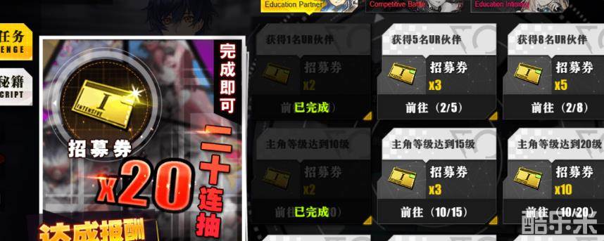 先来看一看伙伴育成,伙伴育成的任务总共有九个。九个任务的haul可以分为获取、养成以及主角等级。获取的话就是获得UR级别的伙伴,这个要通过多次的招募来获得,在获得八个UR伙伴之后可以领完奖励。主角等级很好理解,达到对应等级直接领奖。而养成的话就是提升等级,将八个UR提升到二十级可以获得奖励。这个人任务的奖励是招募券,可以获得二十张奖励。