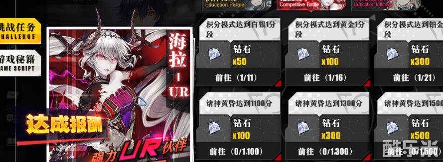 再来看一看竞技战斗,竞技战斗的话是分为积分战斗,诸神黄昏和模拟战的。积分竞技战斗是要求段位的,提升宝铂金可以获得全部的奖励。而诸神黄昏的话是要求积分,这个积分战斗还是有一定难度的。模拟战是参与次数,参与三十次就可以获得奖励。这个任务的奖励是UR海拉的碎片经验值,还是不错的。