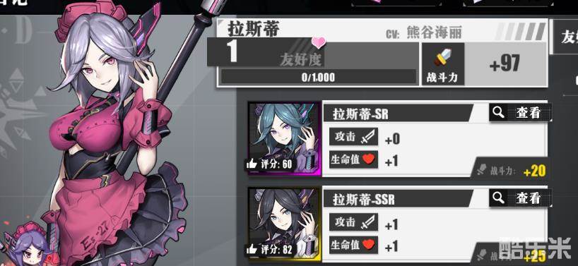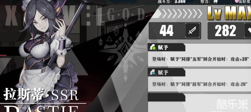 先来看一看SSR的拉斯蒂,这个品级的满级属性是44点攻击力,血量是282点,在近战的这个品级里面算是比较强的,虽然说不是顶点,但也还不错。技能上,特殊的夫赋予技能可以给同排的友军提供39点的攻击力提升。这个技能在每个回合开始的时候都会发动,那么在搭配的时候就要注意伙伴的位置分配了,尽量将这个加成给吃到。