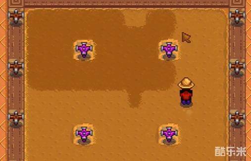 玩家可以在耕地边界外的地面上种植果树。虽然地面似乎已经装饰好了,但树木不会受到影响,可以照常生长。唯一的障碍是树木与地面洒水器之间的距离(周围8个空间有影响树木生长的东西,即以果树为中心的3x3空间有影响果树生长的东西)。