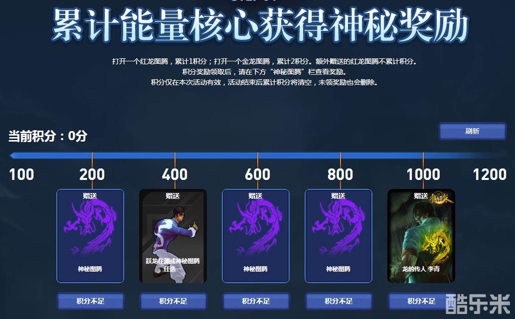 打开一个红龙图腾,累计1积分;打开一个金龙图腾,累计2积分。额外赠送的红龙图腾不累计积分。