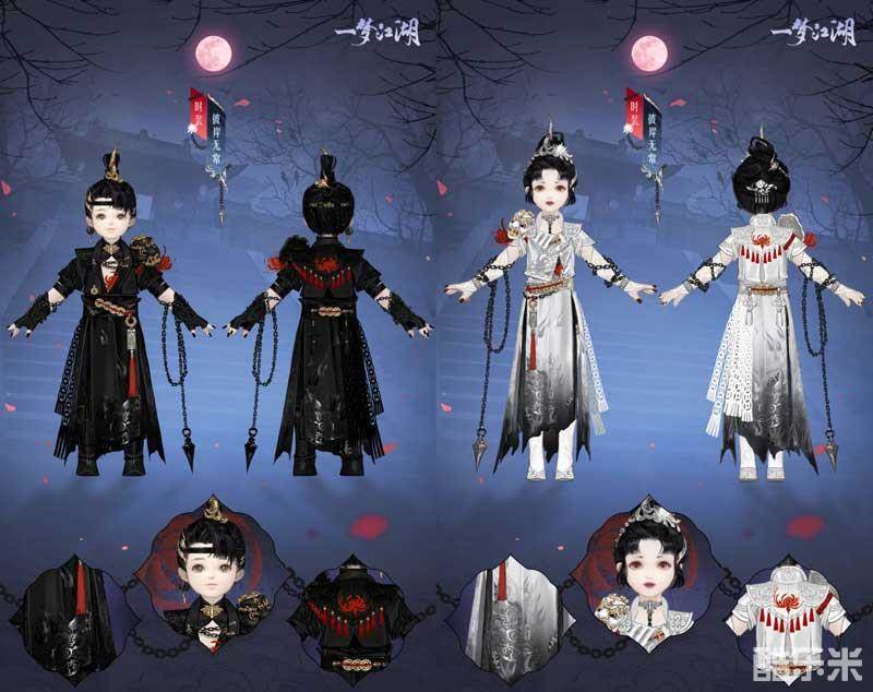 嗜魂寒幽溧黄泉,阴阳无常隔两界。整套时装分为男女两款,男款以黑金配色为主,女款则以白银配色为主,黑白搭配极具特色。