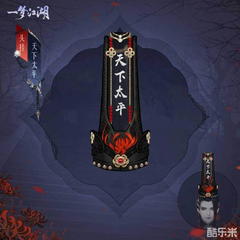 头挂·天下太平通体漆黑,正中绣有“天下太平”四个大字。艳丽的彼岸花在帽底盛放,妖冶的绯红映着极致的墨色,危险而神秘的气质扑面而来。