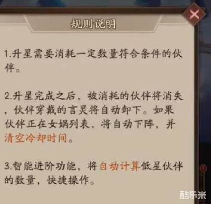 升级六星需要玩家消耗一个五星再加上两个四星的同名。这个要求的话是有一定难度的,尤其是一些极品的伙伴,大家要做好准备。七星需要六星加上两个五星的同族。这个要求就有一定改变,同族的话收集难度会相对小一些的。八星要一个七星加上一个五星的同族,这个个人觉得是降低了要求,核心材料和进阶材料累计一下就行了。