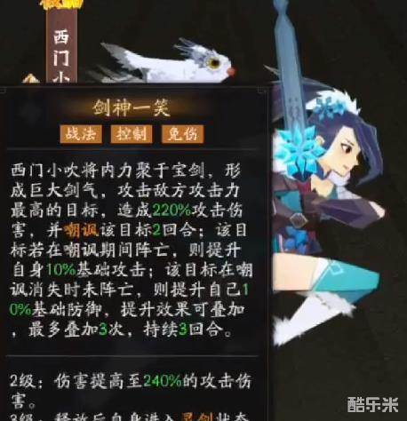 战法技能会造成一个基础的百分比伤害,同时会嘲讽吗目标两个回合的时间。在嘲讽的期间内,如果说敌人阵亡的话,那么西门小吹还会获得攻击力的提升。如果为阵亡可以获得防御提升,收益还不错的。