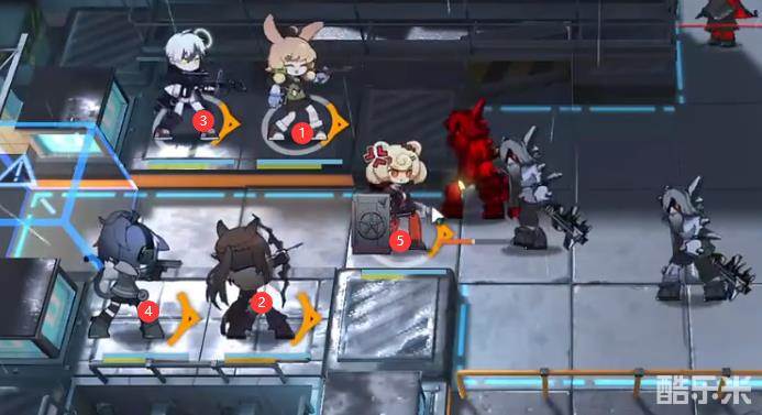 1.如下图所示顺序布置干员。所有狙击干员都向右,最后部署古米。