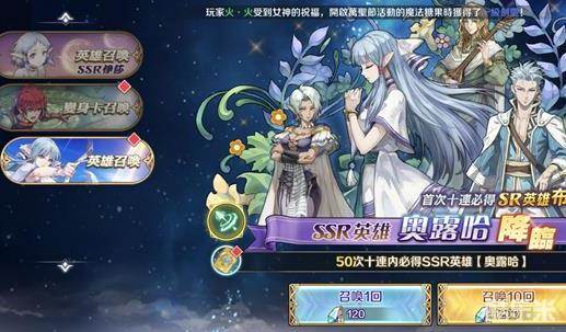 英雄召唤有限时主题,不同主题获得英雄概率不一样,如ssr英雄奥露哈降临主题,则首次十连抽必得sr英雄布兰奇,50次十连抽必得ssr奥露哈。