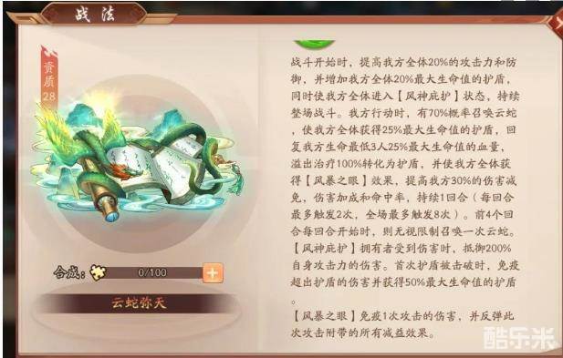 对于普通玩家来说,在单战法选择这一前提下,云蛇弥天的选择更佳。单战法的前提下,效果会更优一些。当然如果有能力的玩家,第一时间合成赤金双战法一定是不二之选(激活的图鉴增益也是很香的)。