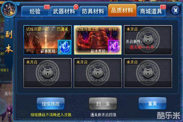 品质副本分为4层,每层分为10个小关卡,后一层都需要先通关前一层才开启,每层对应掉落品质水晶;