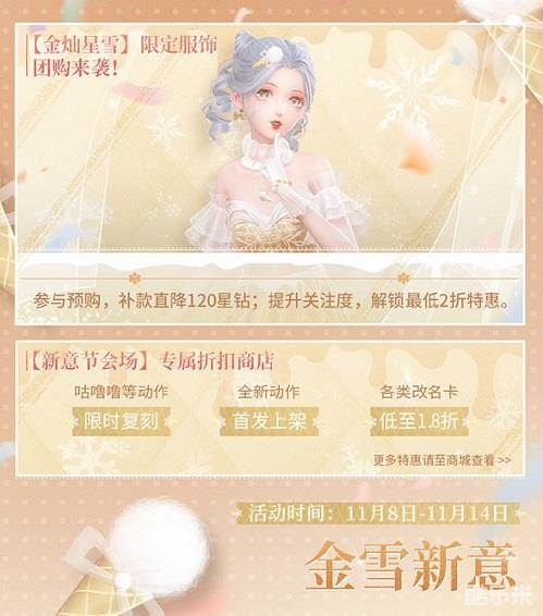 11月8日起,“金雪新意”主题活动第一弹来袭,“金雪新意”限定服饰“金灿星雪”发售,预购时间为11月8日至11月10日,正式开售时间为11月11日至11月14日,玩家参与预购可享补款立减双倍。