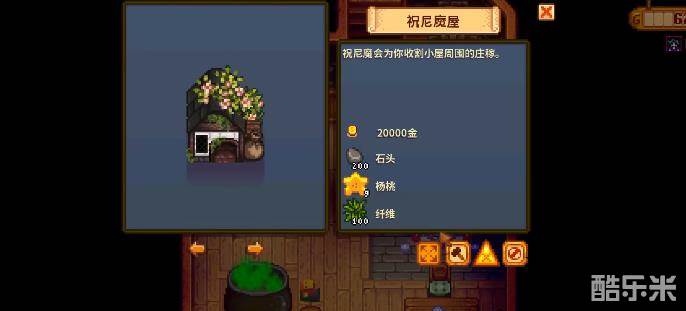 除了献祭之外,还有一个非常重要的作用就是祝尼魔小屋,玩家可以在法师那里购买祝尼魔小屋的建筑,摆放在农场之后,就会有祝尼魔帮助玩家收集农作物,并且放在小屋中,玩家可以拿走农作物。