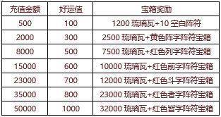 【活动内容】活动期间可通过充值金币获得好运值,积累好运值即可打开宝箱奖励,超多的琉璃瓦,大量的阵符宝箱,绝对超值的提升战力资源,尽在特惠好礼。