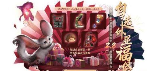 11月11日15:00——11月17日23:59:59,我们将推出自选外显福袋H5活动,各类外显优惠低至2.8折,其中包含很多目前游戏内暂无获取渠道的时装,还有许多其他特惠外显,活动仅七天,各位旅者一定不要错过!