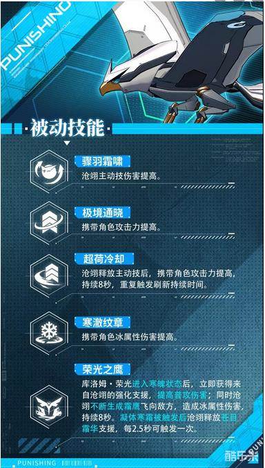 库洛姆荣光进入寒魄状态后,立即获得来自沧翊的强化支援,提高普攻伤害:同时沧翊不断生成霜鹰飞向敌方,造成冰属性伤害持续8秒。凝体寒霜被触发后沧翊释放苍目,霜华支援,每2.5秒可 触发一次。