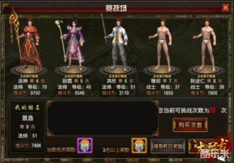 竞技场需要人物达到35级才能挑战,可以任意时间挑战,每日22点会统计竞技场排名,22点后便可以到竞技场界面领取自己排名名次的奖励,排名越靠前,奖励就越丰富。打开竞技场挑战界面时会显示5个玩家的信息,左下角会显示你的等级和战力,你可以自由选择5个其中之一的对手挑战,挑战胜利会取代对方排名,被挑战或战胜信息会显示在面板上,如果突然发现排名往后掉了,可以留意挑战记录面板,那说明有对手战胜你了。购买挑战次数需要消耗10元宝一次。