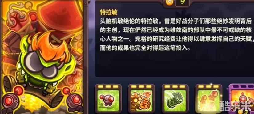 疯狂发明家又叫特拉敏,是维兹南军队中不可或缺的核心人物之一,头脑机敏绝伦,有着很多杀伤力极强的武器,在战斗中也肆意发挥着自己的天赋。特拉敏的一技能会在路上放下多个机器人追踪敌人进行自爆,该技能伤害并不高,升满后一个机器人可以造成80点的伤害,一般用于击杀突破包围圈的残血敌人;