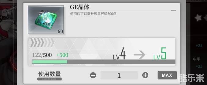 第一个方式也就是最为直接的方式,使用GE晶体来快速的提升舰灵等级。这个道具的话目前是没有品级区分的,每个晶体带来的经验值都是一样的。操作方式也很简单,选择舰灵之后,选择等级旁边的加号按钮就可以进入到提升界面了,可以根据需求来选择晶体的消耗,也可以一次性的加满。