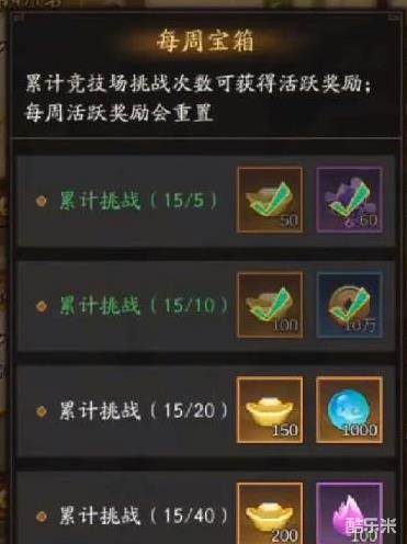 除了基础的排名奖励之外,每周也是有奖励设定的。每周宝箱只要玩家达到一定的挑战次数就可以领取了,不管是胜利还是失败,都会累计次数的。奖励上除了元宝还有资源道具,收益是很不错的。