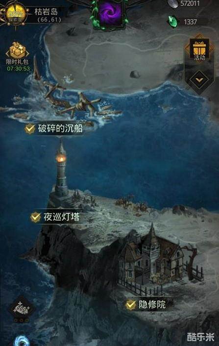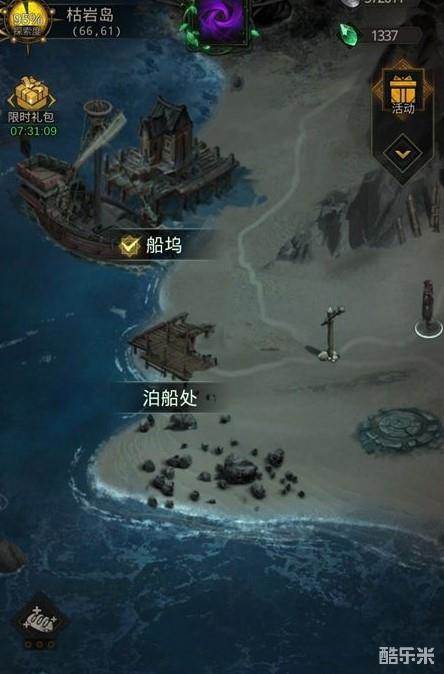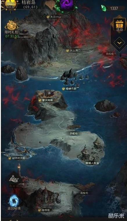 枯岩岛分为一个主岛加4个小岛,开局先把主岛跟南方的小岛的小关全打了,尤其是拿到伐木场的木材要拿到。把篝火旁的鱼人都干掉,跟篝火对话,这时要渡海去西北方的小岛打通火山。