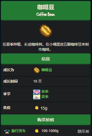 生长咖啡会进行几个阶段的生长,在第10天的时候就会结出咖啡豆的果实,然后会每隔两天结一次果,每次一株可以收获4颗咖啡豆,也会有一定的概率获得更多的咖啡豆,并且在春季和夏季可以一直收获,不用重新种植。所以说玩家可以在春季进行大面积的种植,然后收获大量的咖啡豆,这样在其他的季节也可以酿成咖啡来喝。