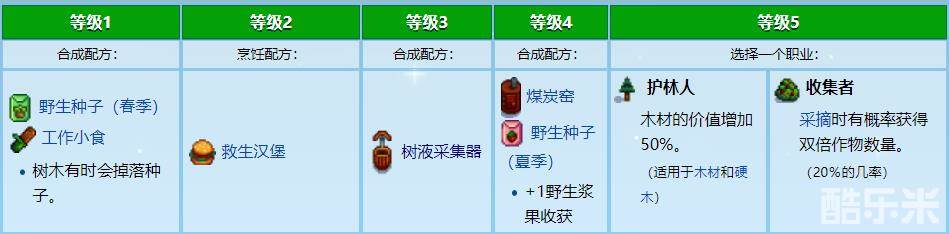 当玩家觅食达到5级之后,我们就可以选择一个职业了,分别是:1.护林人:木材的价值提高50%。2.收集者:采摘时有20%的概率获得双倍作物数量。当你达到10级,我们就可以两种不同的分支。