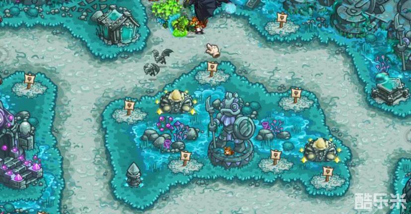 关卡中新出现的学徒敌人是优先消灭的对象,学者在其身边可以增加伤害,而水晶毁灭者在其身边可以增加护甲;水晶毁灭者有着较高的攻击,死亡后会产生爆炸,用死灵墓的灵魂附身操纵其对战敌军比较合适;总体来说,该关卡中出现了较多数量魔抗较高的敌人,玩家可以适当增加一些物理攻击的防御塔来进行作战。中间发亮的青蛙石像点击后可以给己方军队提供一定的无敌时间。