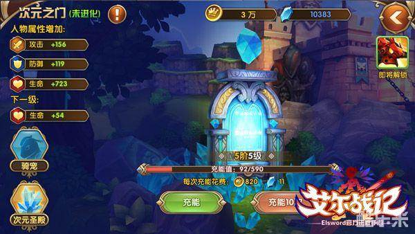 次元之门是坐骑解锁的关键系统之一,玩家可以通过消耗光能及金币为其充能。当累积到一定充能值时,次元之门将会升级,每升10级将自动上升1阶,达到一定阶级后,即可解锁新坐骑。除此之外,次元之门还能为主角增加攻击、防御和生命属性,是极具性价比的提升系统。