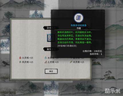 一段剧情后获得秋枫夜话琉璃盏;火水雷风土木灵根+15并结束奇遇