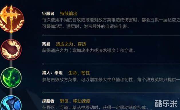 征服者配合齐天大圣的3技能,能够快速叠加层数,增强自身伤害;残暴可以提高齐天大圣的攻击力和护甲穿透;猎人泰坦能够在参与击杀时,永久提升齐天大圣的生命值和韧性;探路者则可以增加英雄的移动速度,提高支援能力。