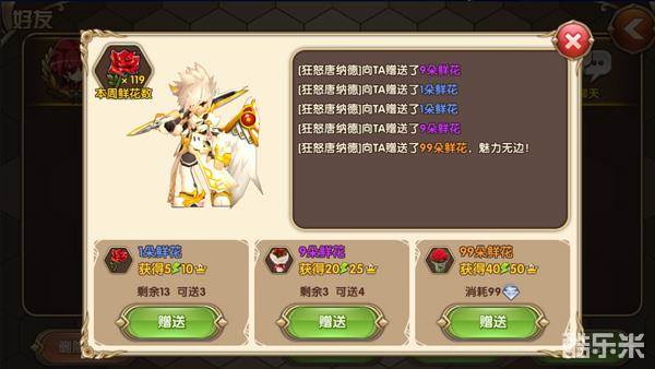 如上图所示,鲜花分为三类:1朵鲜花、9朵鲜花、99朵鲜花。根据赠送不同种类的鲜花,可获得的体力、人品数值也将不同。