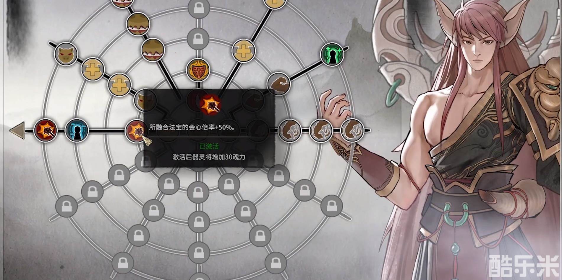 酒尘的天赋就比较偏向召唤流,以及输出,可以使融合法宝的会心倍率增加50%,他有一个天赋非常适合召唤流,玩家在召唤生物的时候有几率使召唤单位获得魔化效果(提升攻速和攻击,以及减少伤害)。在之后的天赋中,可以使这个魔化概率增加到50%,被动技能则是令场上所有敌人护心降低。