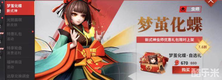 梦茧化蝶的获取途径有两种方式,第一种方式玩家可点击商城进行获取,第二种方式玩家可点击主界面右上方的新活动板块进入,活动大厅里有很多限时的活动,玩家千万不要找错,找到第一个梦茧化蝶新式神,梦茧化蝶属于虫师,女孩子应该特别喜欢此款角色,毕竟长得很美呀。
