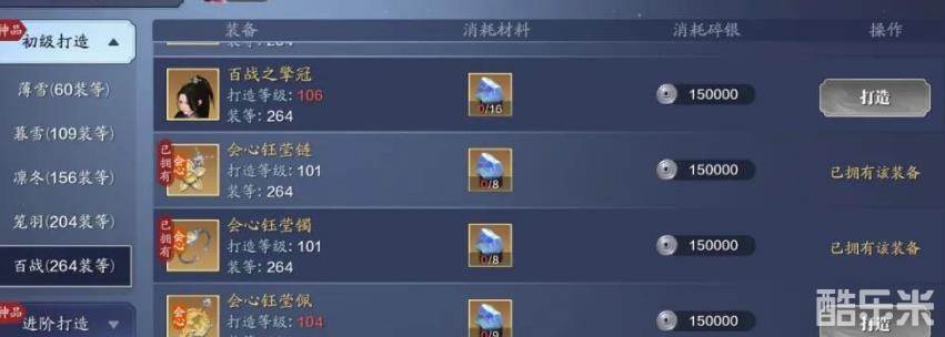2.装备提升:12点刷完101挑战本可制作2件装备,分别是项链和手镯,增加266*2=532点功力,算上精工+80*2=160点功力(6级精工应该是不够),总共可提升692点功力。