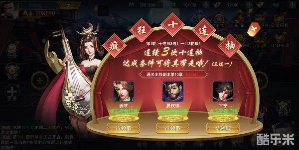 疯狂十连抽只要达成目标,就可以进行三次十连抽。玩家可以根据十连抽的武将,从三次十连抽奖励中带走一组武将,玩家可以根据需求选择合适的武将完善自己想要的阵容。