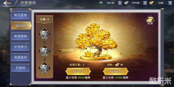 每天可以免费摇两次,获得的银两会根据主公的等级越来越高。每天摇一摇,财富就有了。